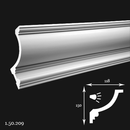 The polyurethane cornice 1.50.209 is a classic profile that provides a smooth transition between the wall and ceiling. Thanks to the unique properties of the material, it is lightweight, exceptionally water-resistant, and UV-resistant, ensuring durability and ease of installation.