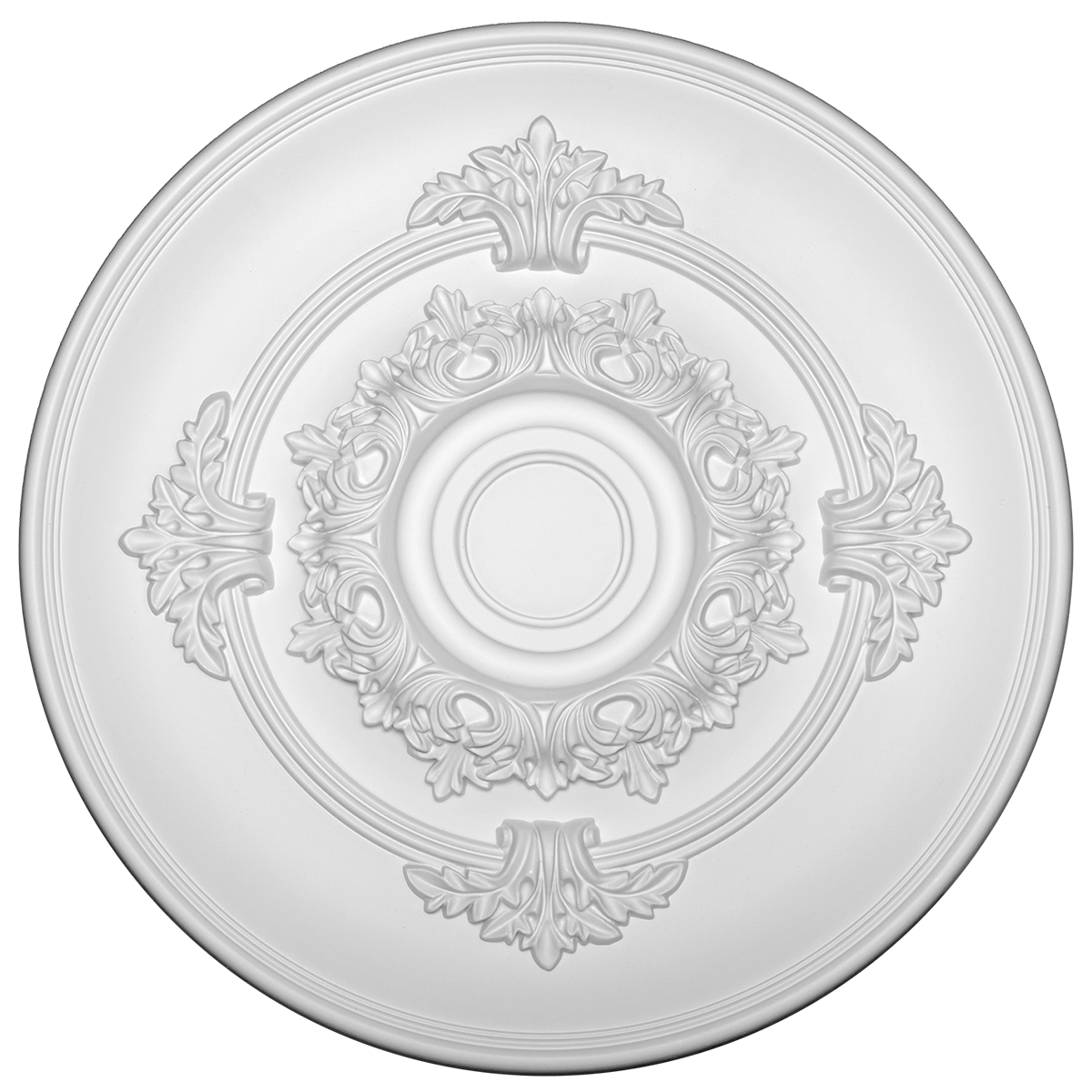 Polyurethane ceiling rosette 1.56.049. A ceiling decor in classical style with an elegant relief pattern featuring floral elements. Thanks to the unique properties of the material, it is lightweight, exceptionally water-resistant, and UV-resistant, ensuring durability and ease of installation.