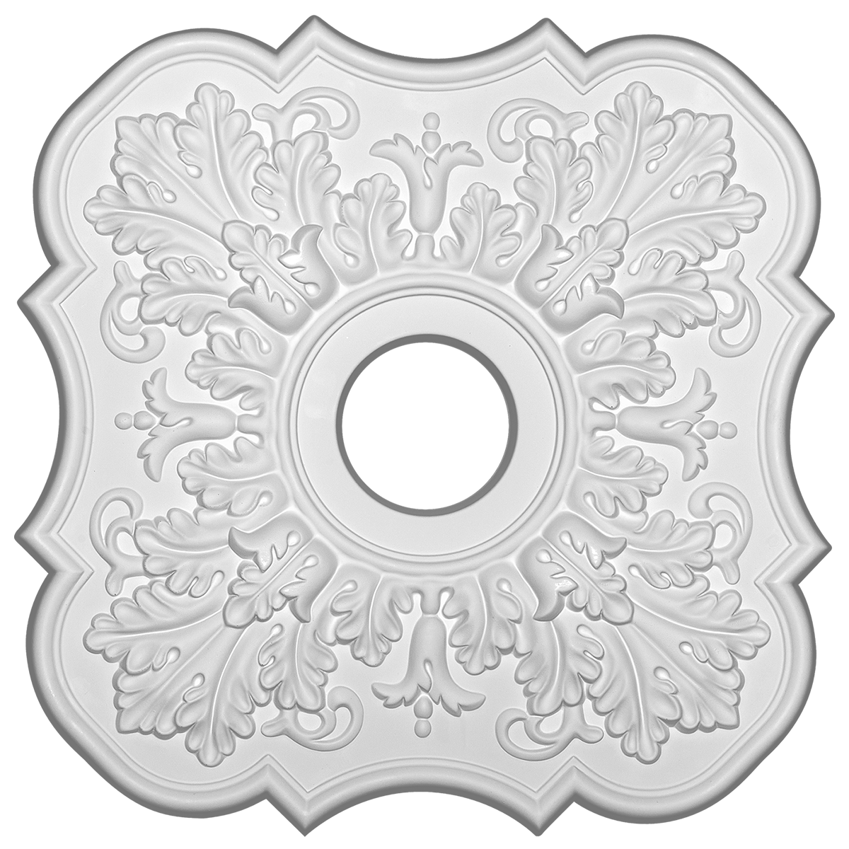 Polyurethane ceiling rosette 1.56.053. A square-shaped ceiling decor in classical style with an elegant relief pattern and a central opening. Thanks to the unique properties of the material, it is lightweight, exceptionally water-resistant, and UV-resistant, ensuring durability and ease of installation.