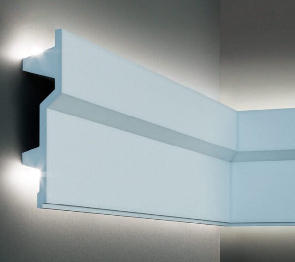 La cornisa para iluminación LED oculta KF707, fabricada con material Polyforce, es una solución moderna para interiores. Gracias a sus propiedades, es ligera y resistente a la humedad y a los rayos UV, lo que garantiza su larga vida útil y una fácil instalación.