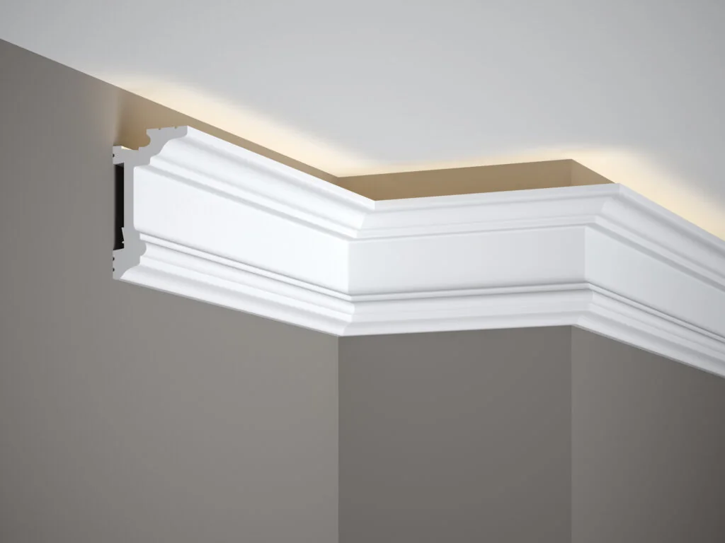 El perfil MD367 para iluminación LED oculta, fabricado con Polyforce, es una solución moderna para interiores. Gracias a las propiedades del material, la cornisa es ligera y ofrece una excelente resistencia a la humedad y a los rayos UV, lo que garantiza su larga vida útil y una fácil instalación.