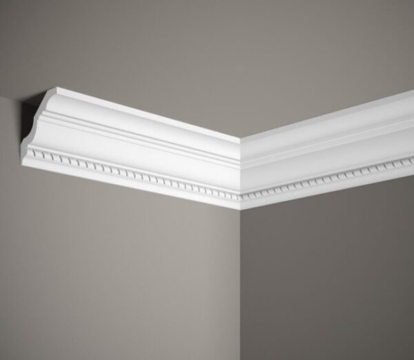 Cornisa de poliuretano MDA106: un perfil clásico con un adorno que garantiza una transición fluida entre la pared y el techo. Gracias a las propiedades únicas del material, es ligero, altamente resistente a la humedad y a los rayos UV, lo que garantiza su durabilidad y facilidad de instalación.