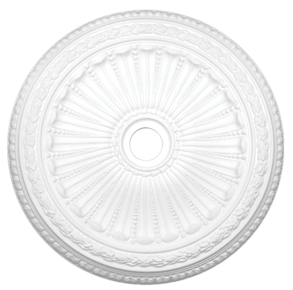 Rosetón de poliuretano R189. Decoración de techo de estilo clásico con un elegante estampado en relieve. Gracias a las propiedades únicas del material, es ligero, resistente a la humedad y a los rayos UV, lo que garantiza su durabilidad y facilidad de instalación.