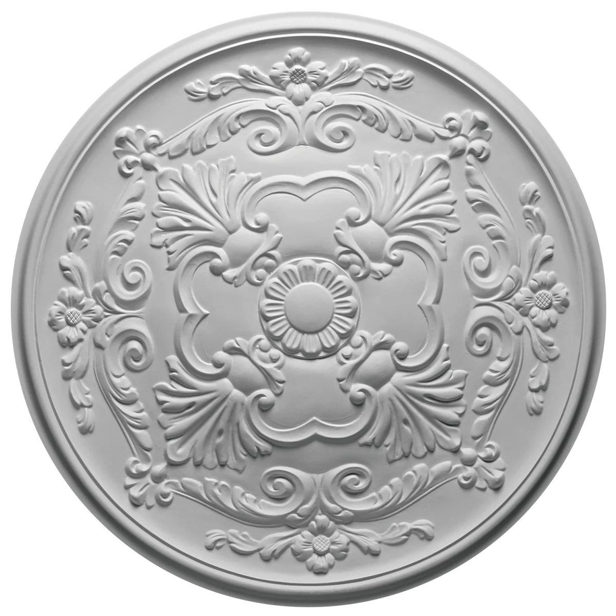 Poliuretāna griestu rozete 1.56.024. Griestu dekors klasiskajā stilā ar elegantu reljefa lapu rakstu. Pateicoties unikālajām materiāla īpašībām, tā ir viegla, mitrumizturīga un izturīga pret UV starojumu, nodrošinot ilgmūžību un vieglu uzstādīšanu.