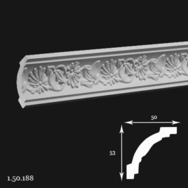 Poliuretāna karnīze ar ornamentu 1.50.188 ir klasisks profils, kas nodrošina vienmērīgu pāreju starp sienu un griestiem. Pateicoties unikālajām materiāla īpašībām, tā ir viegla, mitrumizturīga un izturīga pret UV starojumu, nodrošinot ilgmūžību un vieglu uzstādīšanu.