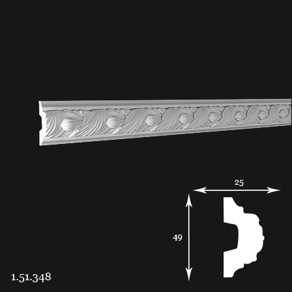 Poliuretāna moldings 1.51.348 — klasiskā profila elements, ko var izmantot dekoratīvo rāmju izveidei, telpu zonēšanai, durvju apmalēm, kā arī mēbeļu dekorēšanai, saglabājot vienotu interjera stilu. Pateicoties materiāla unikālajām īpašībām, tas ir viegls, mitrumizturīgs un UV izturīgs, nodrošinot tā izturību un vieglu uzstādīšanu. Pieejams arī elastīgā FLEX versijā.