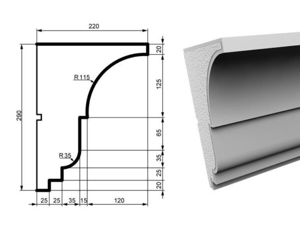 «Фасадный карниз KC132 – это изысканный элемент декора, изготовленный из высококачественного пенополистирола и покрытый прочным акриловым слоем с добавлением мраморной крошки. Этот карниз идеально подходит для оформления дома по периметру в месте соединения крыши и стены, придавая фасаду законченный и изысканный вид.
