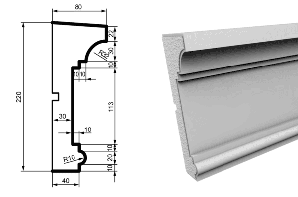 «Фасадный молдинг MC140 – это изысканный элемент декора, изготовленный из высококачественного пенополистирола и покрытый прочным акриловым слоем с добавлением мраморной крошки. Этот подоконник станет идеальным выбором для создания декоративного акцента, придающего вашему дому уникальный и стиль.